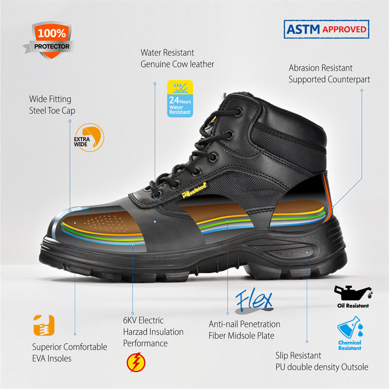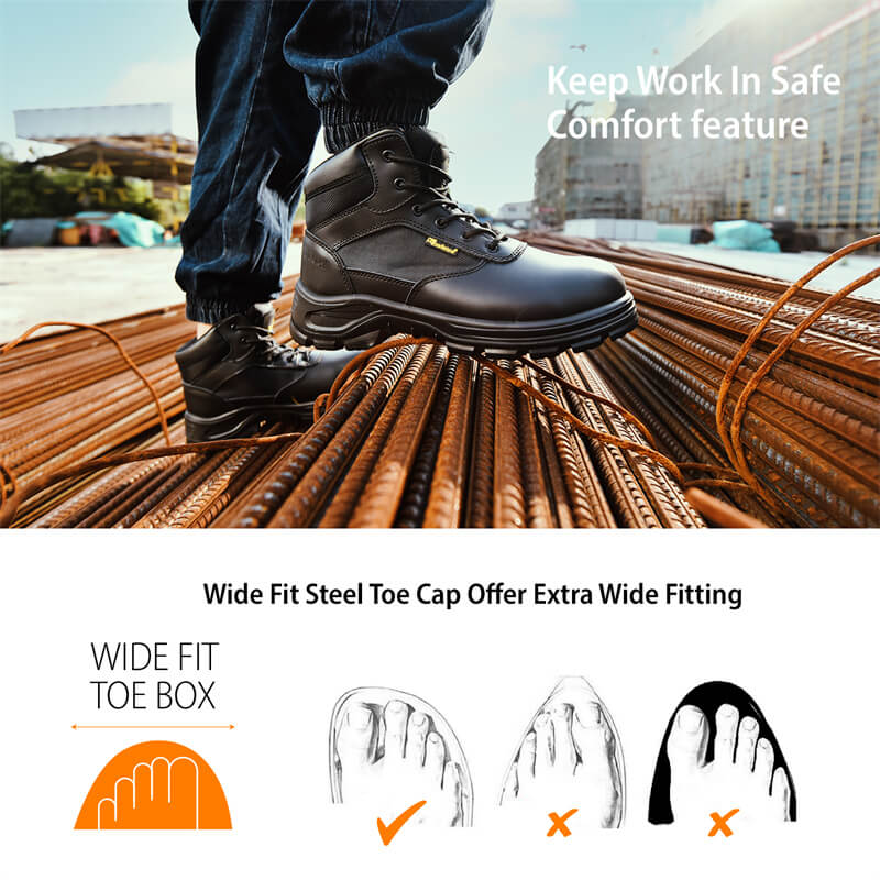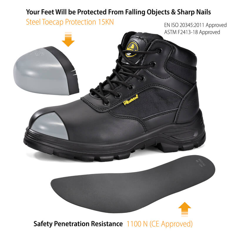 ☑ Steel Toe Cap & Steel Midsole Plate: Stainless steel toe cap can reach 200 joules impact force. Steel Plate can resist 1100 newtons nail puncture force.