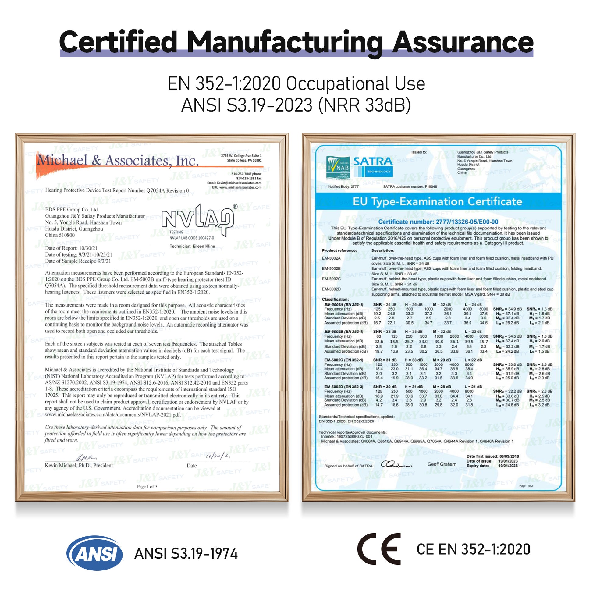 Meets ANSI S3.19-1974 & EN352-1 standards for construction/aviation, includes test reports for safety earmuff protection.
