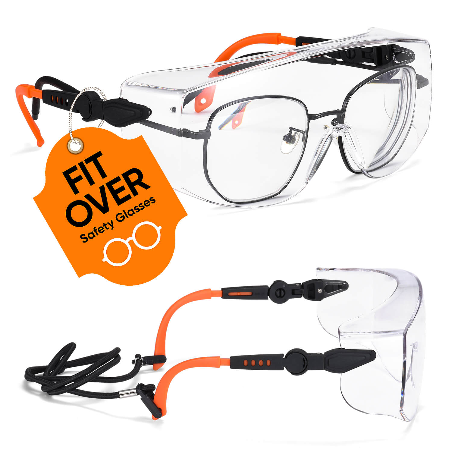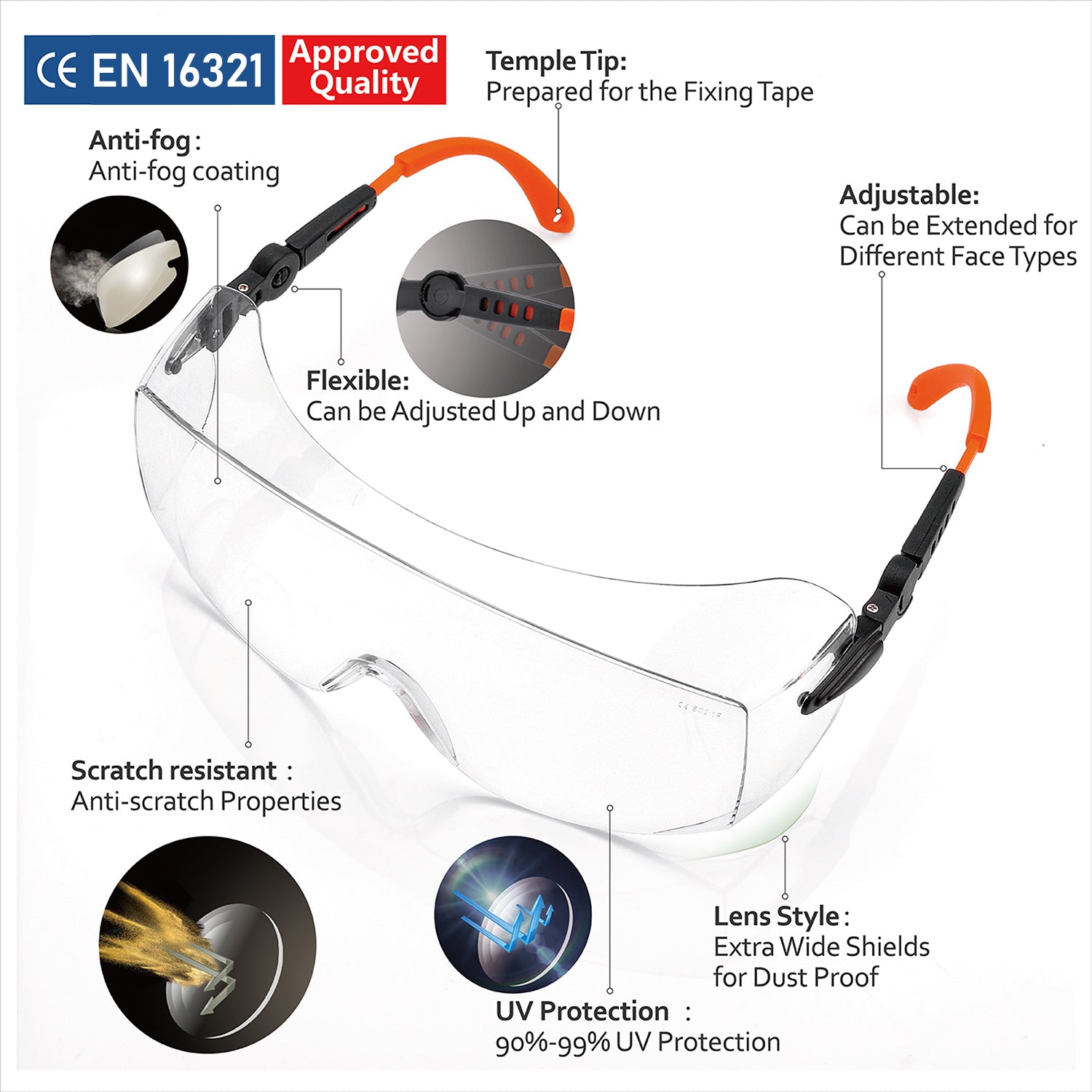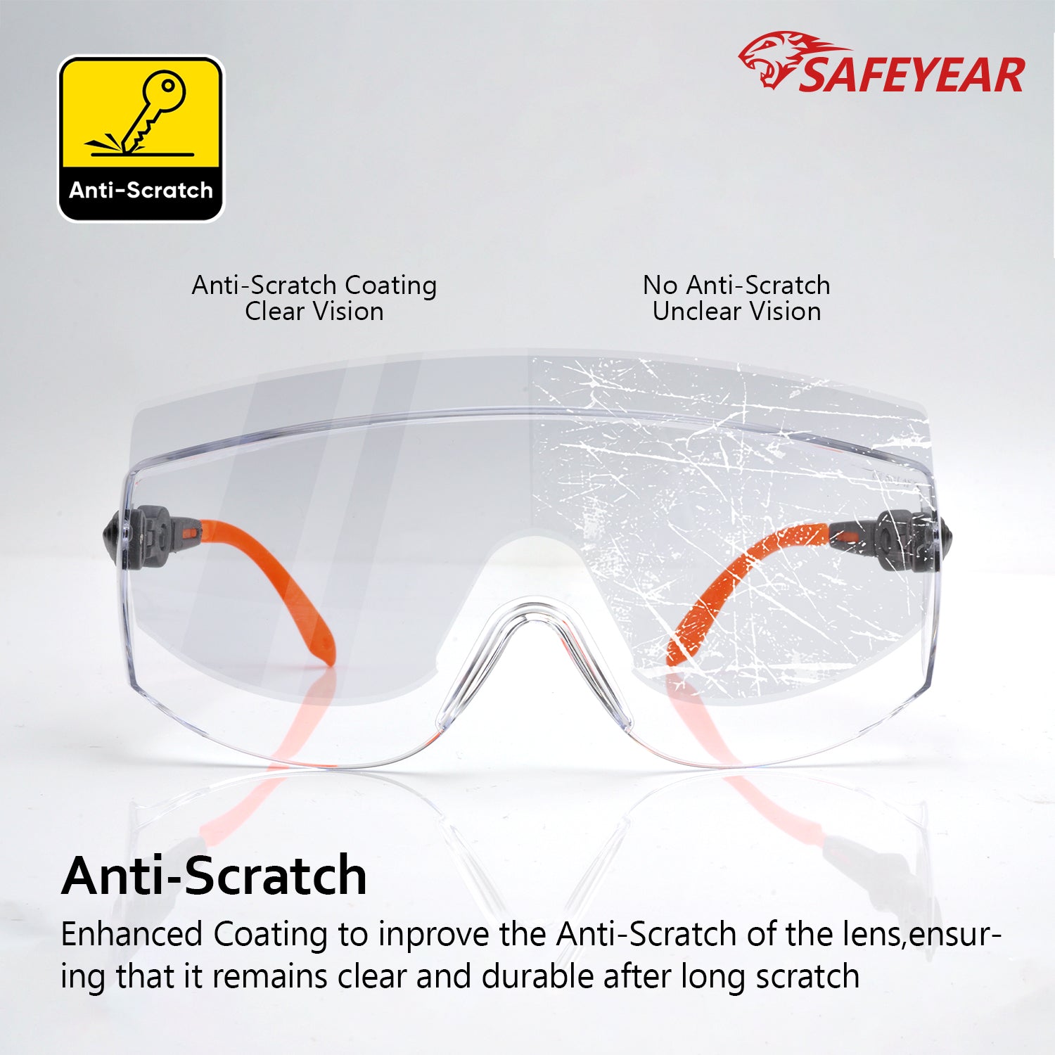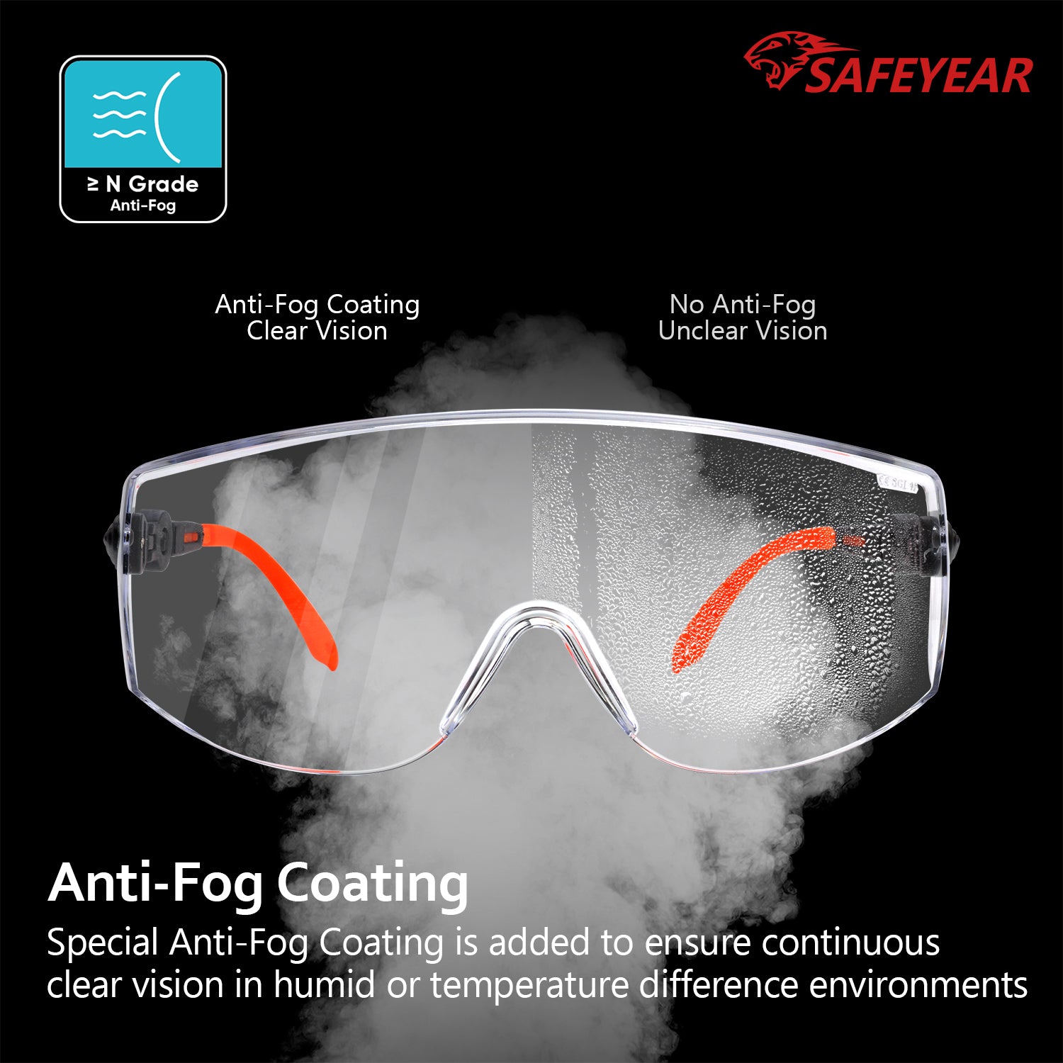 SAFEYEAR Over Glasses Safety Goggles ANSI/EN16321 - Anti-Fog Adjustable Arms