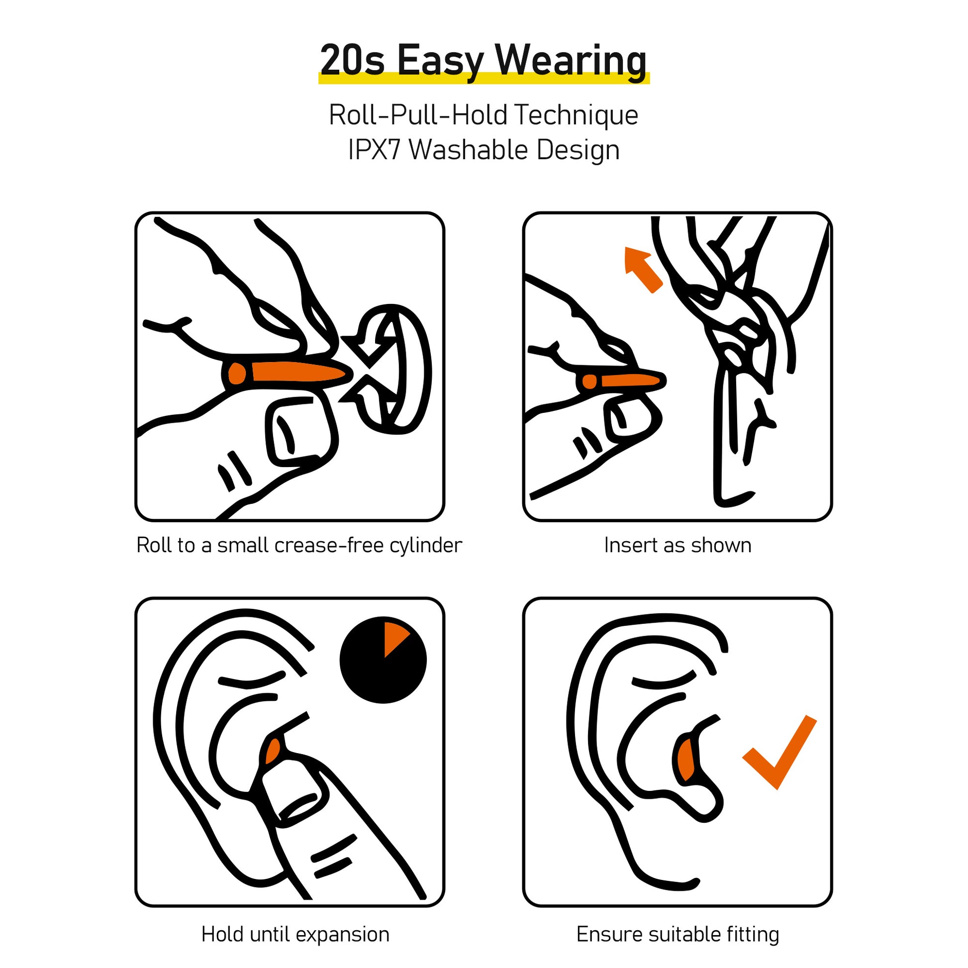 Patented open-cell foam expands gradually in ear canal (8-12 sec), creating a custom-fit seal without pressure pain. Hypoallergenic & non-toxic for 8-hour wear.